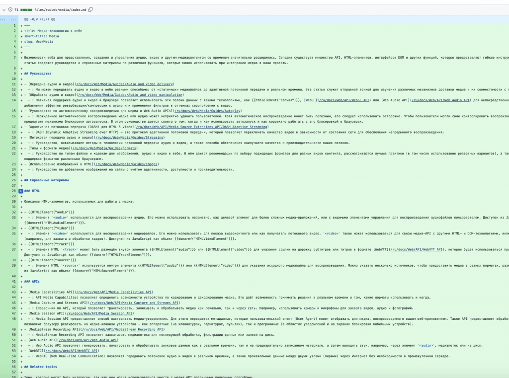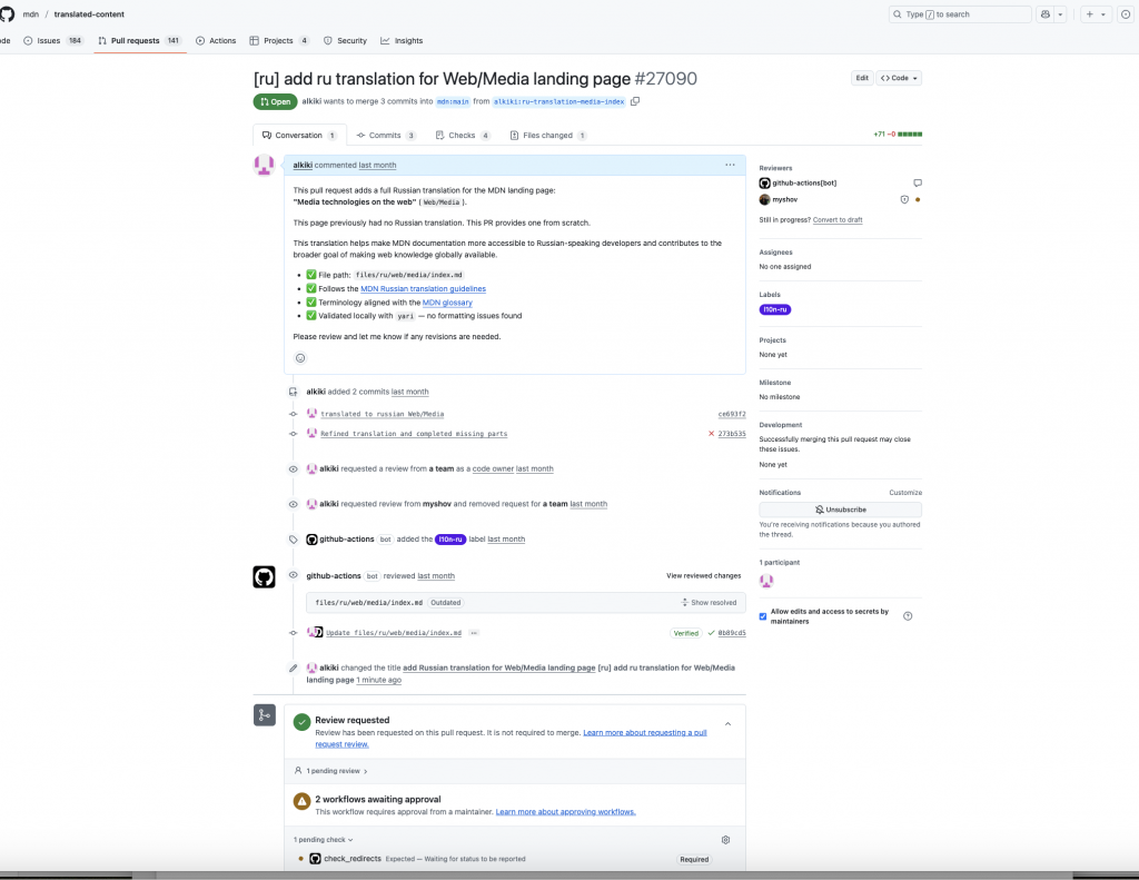 Before pushing in order to check if the layout of the page is correct and there have been no mistakes, MDN community uses a simple shell command (echo … >> .env) to create a dotenv file that defines the CONTENT_TRANSLATED_ROOT environment variable (pointing the preview server at your local copy of the translated-content files), and then run yarn start (invoking the project’s Node-based dev server) to load those settings and serve the translated MDN site at http://localhost:5042 for live testing. I used it to check if the layout is correct and there are no visual errors.