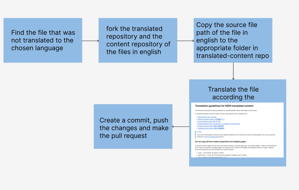 The navigation and execution were pretty straightforward, but since it was my first time translating it, I was a bit unsure about the accuracy and correctness of my translation, considering that the text consisted of a lot of technical terms. I forked both of the repositories (source one and the translated content one) -> copied the source file to the translation-content repository -> edited the source commit, and the front matter of the document -> checked the layout of the translated page locally -> pushed my changes -> created the pull request.