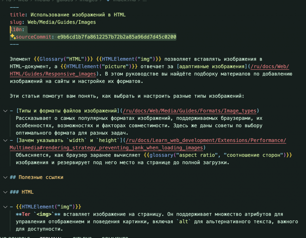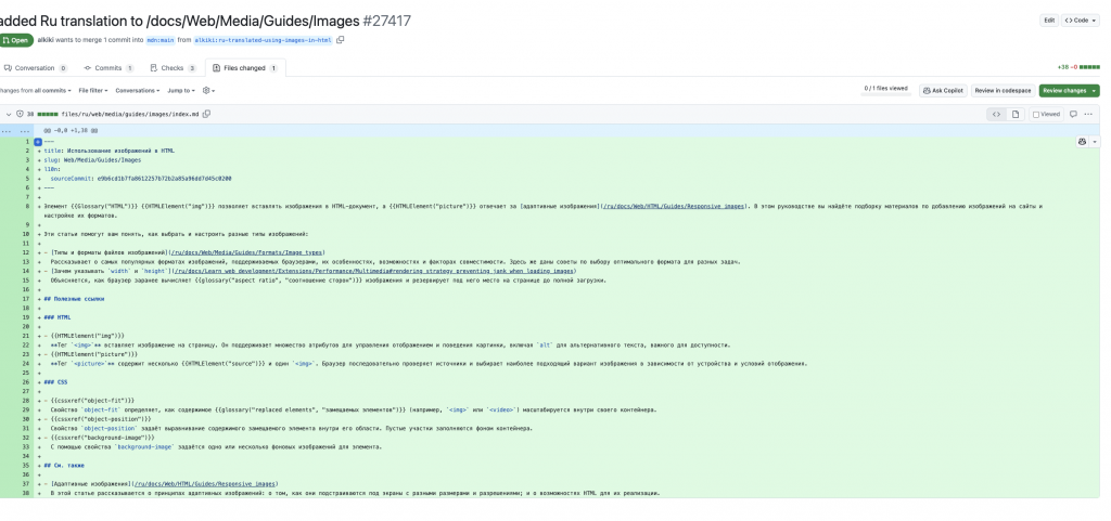 My third PR translated the Using images in HTML guide because it’s the ultimate cheat sheet—from <img> basics to responsive <picture> setups and CSS tricks like object-fit—that saved me from layout jumps and slow-loading pictures in my own projects. By localizing its clear explanations and performance best practices, I’m giving Russian-speaking devs that same shortcut to rock-solid image delivery.